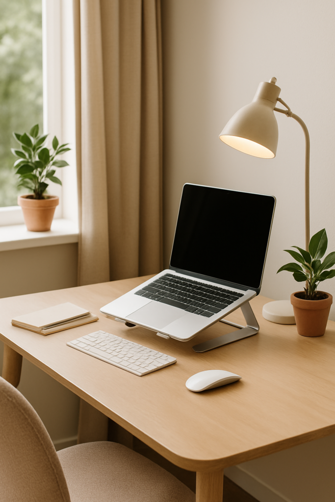 Tip: gebruik een laptop standaard en verstelbare bureaulamp. Die zorgen niet alleen voor comfort, maar ook voor meer focus.